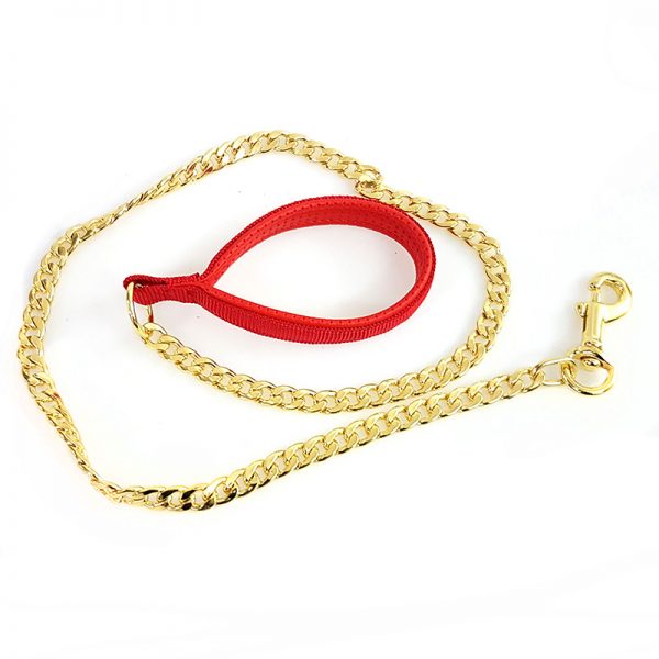 Collar de fantasia para perro de color oro brillante con eslabones y unido a un collar rojo.